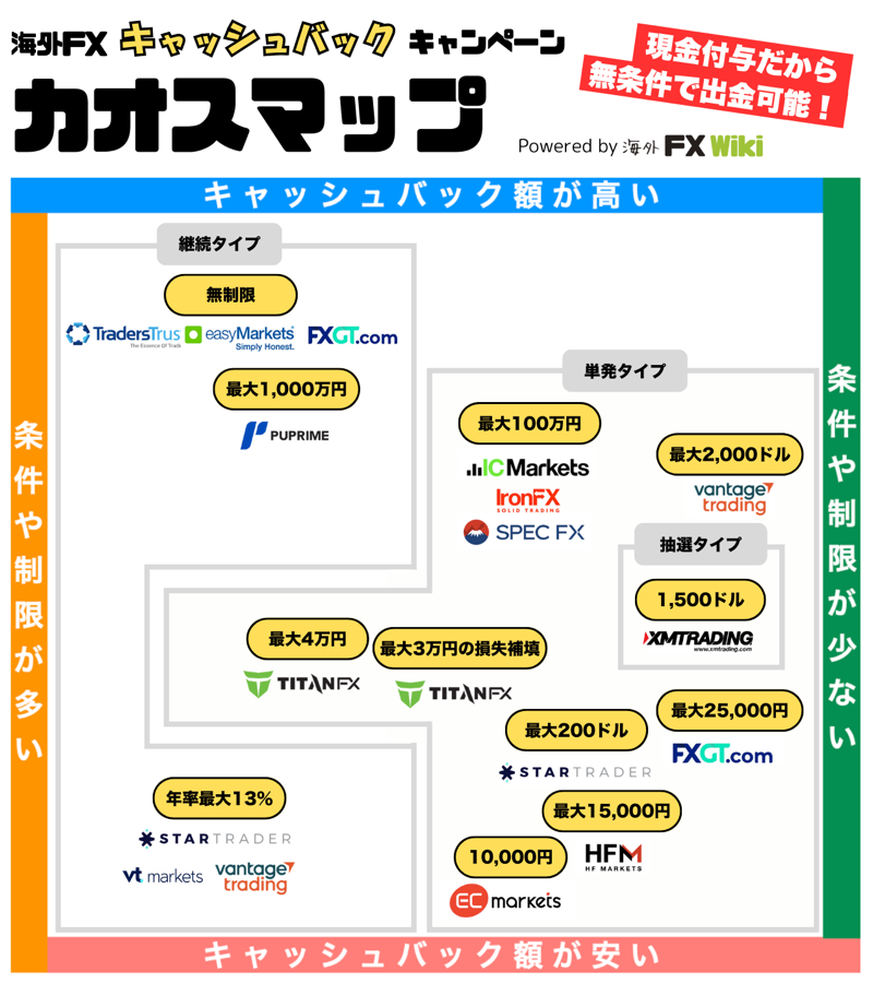 上記は、海外FX業者のキャッシュバックキャンペーンを、キャッシュバック額と獲得条件や取引制限の厳しさで大まかに分類したものです。