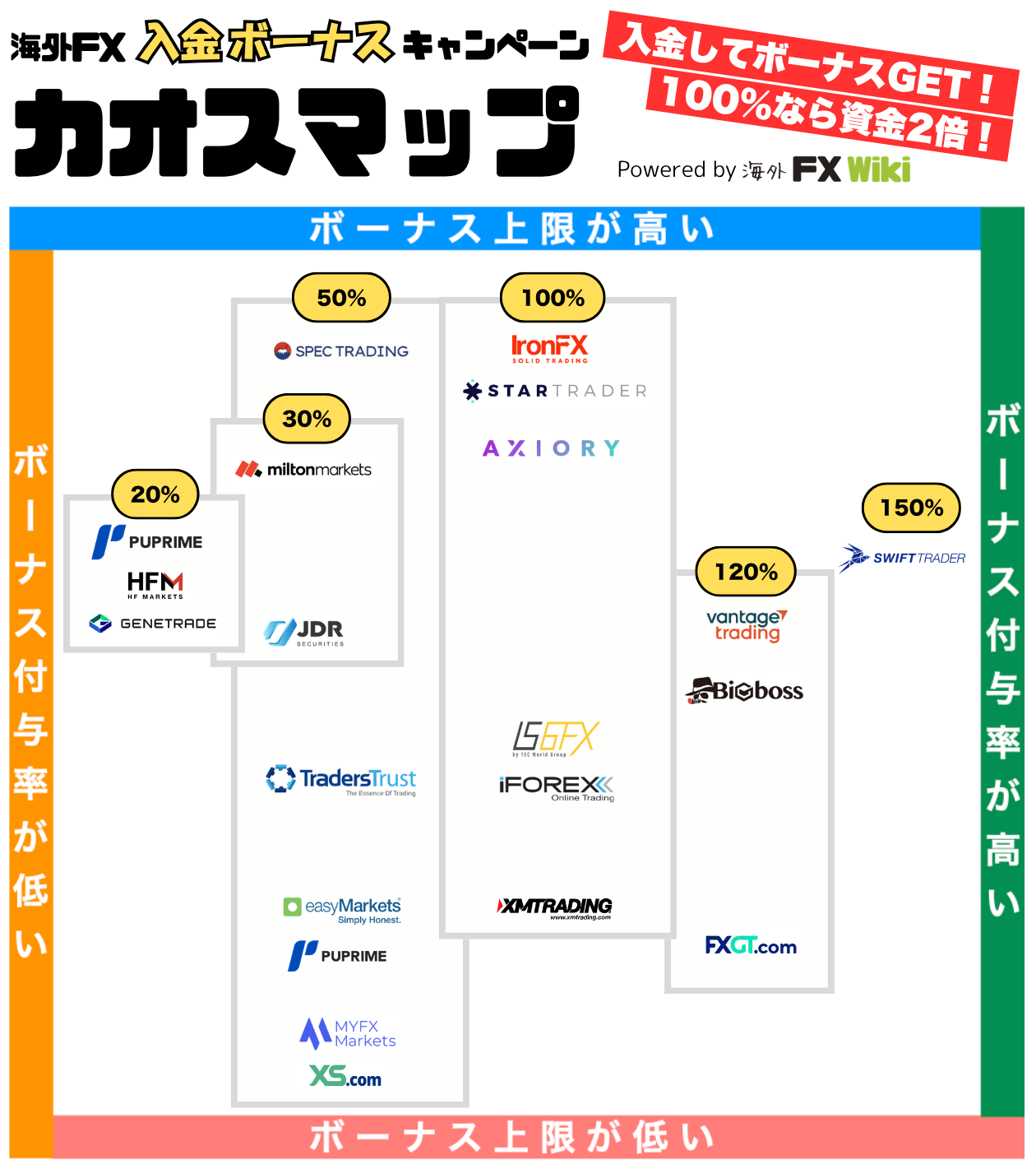現在は、上限5万円の100%入金ボーナスが最も多く提供されており、海外FX業者の入金ボーナスを検討する際のベンチマークとして考えることが可能です。